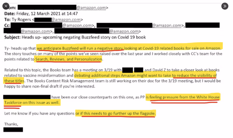 Hyvin dokumentoitujen tosiasioiden joukossa on, että Valkoinen talo puuttui suoraan Amazonin omiin markkinointimenetelmiin paheksuakseen kirjoja, jotka herättivät epäilyksiä Covid-rokotteesta ja kaikista rokotteista. Amazon vastasi vastahakoisesti, mutta teki kaikkensa tyydyttääkseen sensuurin. Kaikki nämä yritykset – Google, YouTube, Facebook, Amazon – myötäilivät Bidenin hallinnon prioriteetteja, jopa siinä määrin, että Valkoista taloa tehtiin algoritmimuutoksia ennen niiden toteuttamista.