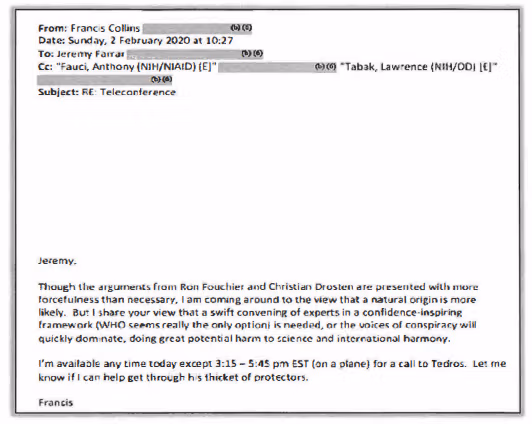 Seuraavana päivänä Collins kirjoitti Farrarille vahvistaakseen, että hän jatkoi asian käsittelyä WHO:n pääjohtajan Tedros Adhanom Ghebreyesusin kanssa. Collins kertoi Farrarille olevansa "tulossa siihen näkemykseen, että luonnollinen alkuperä on todennäköisempi", mutta sanoi, että WHO:n on tutkittava asiaa – lisäten kuitenkin, että hän "jakaa näkemyksesi" siitä, että tämän on tarkoitus olla pääasiassa "luottamusta herättävä" aloite "salaliittoteorioiden" torjumiseksi, jotka muuten voisivat aiheuttaa "suurta haittaa tieteelle ja kansainväliselle harmonialle". Tämä viittaa epäneutraalin poliittisen agendan tavoitteluun, paljon enemmän kuin Faucin edellisenä päivänä lähettämä sähköposti, jota ilmeisesti ajaa Farrar.