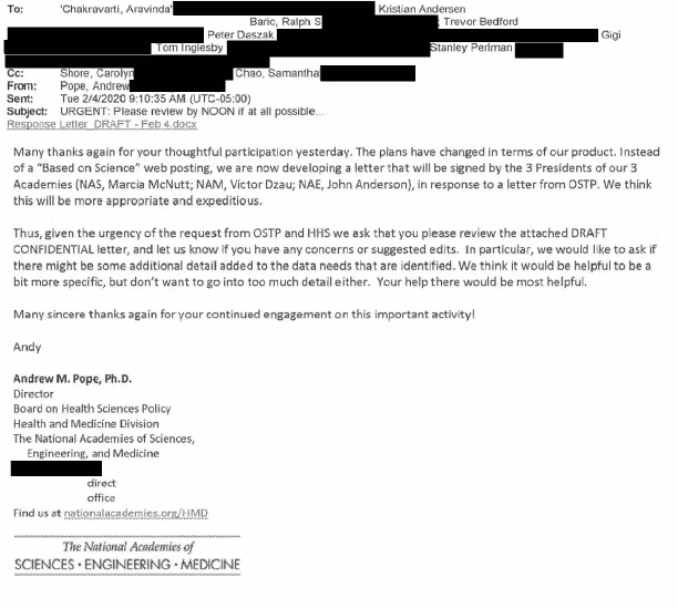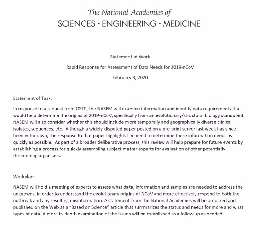 Seuraavaksi tapahtunut on ratkaisevan tärkeää. Faucin ehdottamaa puolueetonta tutkimusta ei koskaan toteutettu. Sen sijaan helmikuun 3. päivänä – kaksi päivää puhelinkonferenssin ja Faucin sähköpostin jälkeen – kutsuttiin koolle uusi puhelinkonferenssi, jonka isännöi National Academy of Sciences, Engineering and Medicine (NAS). Tämä oli vastaus Yhdysvaltain hallituksen pyyntöihin saada tieteellistä neuvontaa viruksen alkuperästä. Fauci kutsuttiin esittämään "NIH:n/NIAID:n näkökulma" ennen avointa keskustelua. Kokousta edeltävä ehdotettu tuotos näyttää olleen "tieteeseen perustuva" verkkojulkaisu, joka muistuttaa Andersenin ja muiden jo työstämää aihetta.