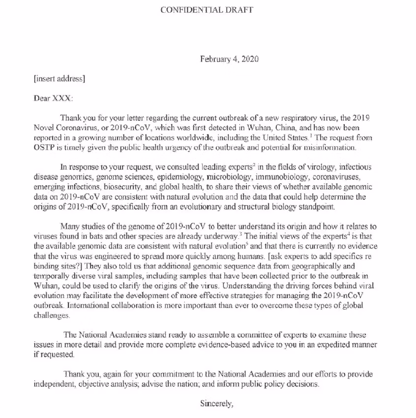 Kuten alla voidaan nähdä, NAS:n lausunnossa (kirjeen muodossa) väitetään konsultoineensa asiaankuuluvia tieteellisiä asiantuntijoita (tämä oli oletettavasti telekonferenssin tarkoitus) ja raportoidaan heidän yksimielisyydestään siitä, että saatavilla oleva genomitieto on "luonnollisen evoluution mukainen" eikä ole "todisteita" siitä, että virus olisi keinotekoisesti valmistettu. Tämä ei tietenkään ole reilu yhteenveto keskusteluista, joita tiedemiehet todellisuudessa kävivät tuolloin. Pikemminkin se edustaa poliittista pyrkimystä sulkea laboratorioalkuperäteoria – itse asiassa tällaisen pyrkimyksen alkua.