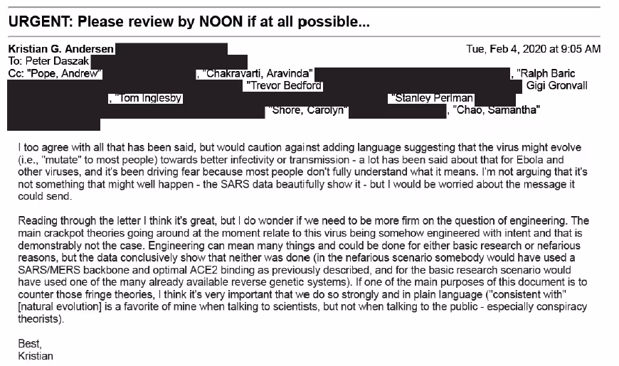 Kristian Andersen oli mukana sekä Faucin 1. helmikuuta että NAS:n 3. helmikuuta pitämässä telekonferenssissa, ja mielenkiintoista kyllä, hänen panoksensa jälkimmäisen jälkeen oli painostaa lausuntoa, jossa vahvistetaan viruksen keinotekoisen aiheuttamisen hylkäämistä, väittäen, että "tiedot osoittavat kiistatta", ettei se ollut. Tämä siitä huolimatta, että hän on... avainääni sekä ennen tätä että sen jälkeen väittäen, että laboratorioalkuperää ei voida sulkea pois.