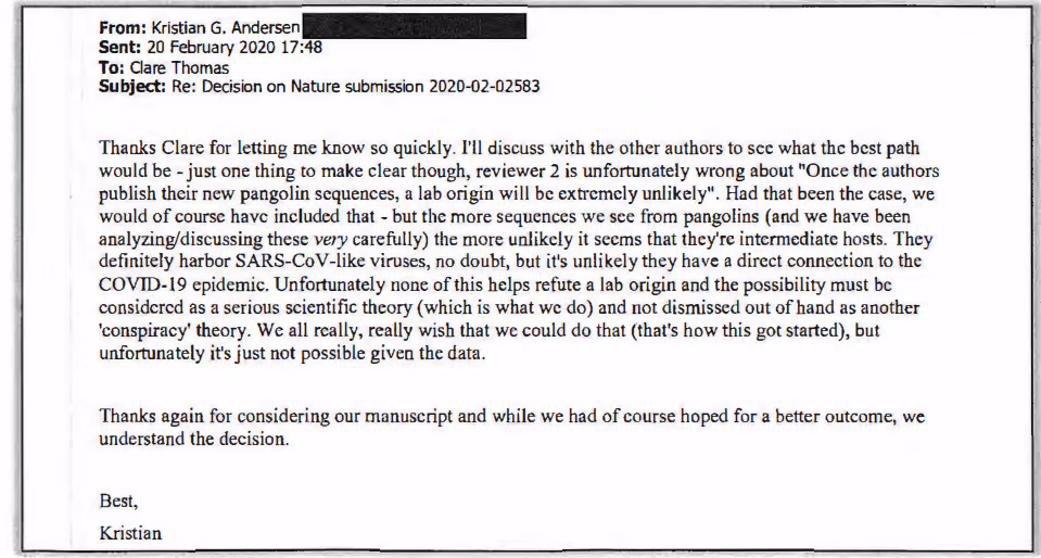 "Proksimaalista alkuperää" käsittelevää artikkelia muutettiin sitten laboratorioalkuperän hylkäämiseksi voimakkaammin ennen kuin se hyväksyttiin julkaistavaksi Nature MedicineAndersen kertoi edustajainhuoneen pandemia-alivaliokunnalle muuttanut näkemystään laboratorioalkuperän mahdollisuudesta hylkäämisen ja uudelleenlähettämisen välillä, minkä on siis täytynyt tapahtua 20. ja 27. helmikuuta välisenä aikana. Kuten tiimi kuitenkin totesi... julkinen ovat osoittaneet, on selvää, että Andersen piti laboratorioperäistä alkuperää (mukaan lukien insinööritaito) uskottavana tämän päivämäärän jälkeen. Huhtikuun 16. päivänä hän kirjoitti kanssakirjoittajilleen: "En ole vieläkään täysin vakuuttunut siitä, ettei kulttuurilla ollut osuutta asiaan. Emme myöskään voi täysin sulkea pois insinööritaitoa (perustutkimuksessa)." On ilmeistä Andersenin viesteistä Tuo paine laboratorioalkuperän hylkäämiseen tuli "ylemmistä tahoista", ja hän joko teeskenteli hylkäävänsä teorian tai oli keinotekoisesti puhunut itsensä siihen jonkin aikaa.