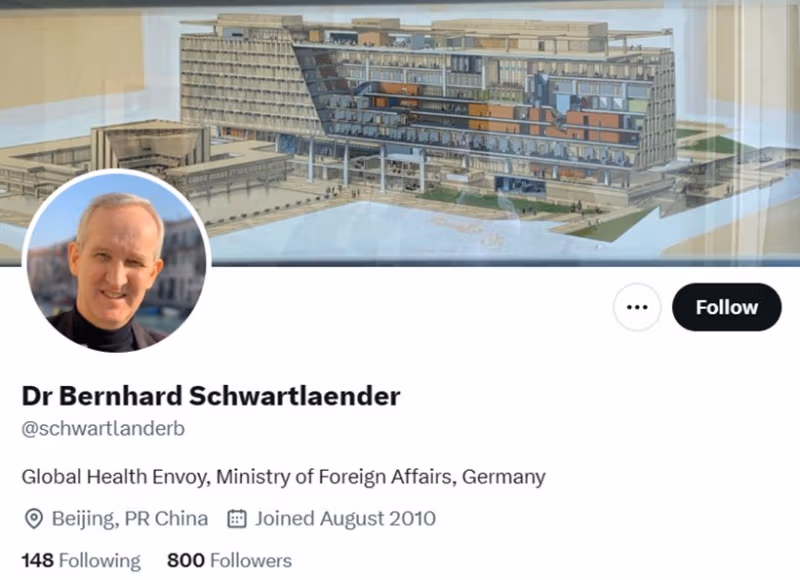 - Kabinettipäällikkö WHO:n pääjohtajan Tedros Adhanom Ghebreyesuksen johtaja tänä aikana oli saksalainen epidemiologi – ja nykyinen Saksan ulkoministeriön virkamies – Bernhard Schwartländer. Usko tai älä, ennen kuin hänestä tuli Tedrosin Kabinettipäällikkö Heinäkuussa 2017, vain puolitoista vuotta ennen virallista Covid-19-epidemian alkamispäivää Wuhanissa, Schwartländer oli toiminut WHO:n edustajana Kiinassa. Hän toimii tällä hetkellä Saksan ulkoministeriössä "globaalin terveyslähettilään" tittelillä. Hämmästyttävää kyllä, hänen X-profiilinsa, kuten alla näkyy, ja muiden dokumenttien perusteella (tätä ja tätä), Saksan ”globaali terveyslähettiläs” työskentelee Saksan suurlähetystössä Pekingissä.