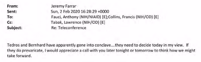 Kun esimerkiksi tammi-helmikuun 2020 lopulla Anthony Fauci, Jeremy Farrar ja muut anglosferalaiset tiedemiehet ja kansanterveysviranomaiset huolestuivat merkeistä, jotka osoittivat SARS-CoV-2:n mahdollisesti olevan geenimuunneltu, ja halusivat WHO:n johtavan tutkimusta sen alkuperästä, he vetosivat "Tedrosiin ja Bernhardiin", kuten alla on esitetty. Tietosuojavaltuutettu sähköposti tekee selväksi.