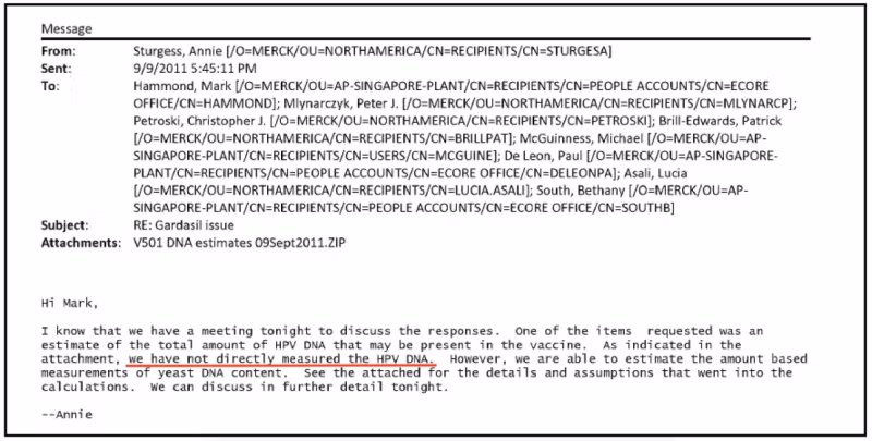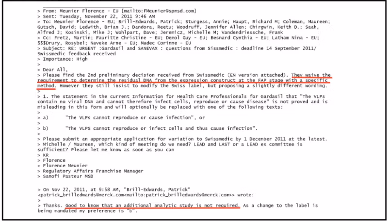 Sisäiset sähköpostit paljastavat, että Merck tiesi, että sen Gardasil-rokote oli saastunut rokotteen valmistusprosessista peräisin olevilla HPV-DNA-fragmenteilla, ja lobbaili sääntelyviranomaisia testausvaatimusten ohittamiseksi.