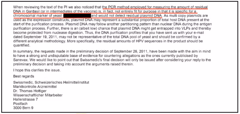 Swissmedicin tohtori Thomas Hottiger varoitti Merckiä, että sen menetelmä "ei ollut täysin tarkoitukseen sopiva", ja selitti, että yrityksen olisi käytettävä PCR-testiä. erityinen HPV-plasmidi-DNA:n havaitsemiseksi, sillä se käyttäytyy eri tavalla kuin hiiva-DNA.