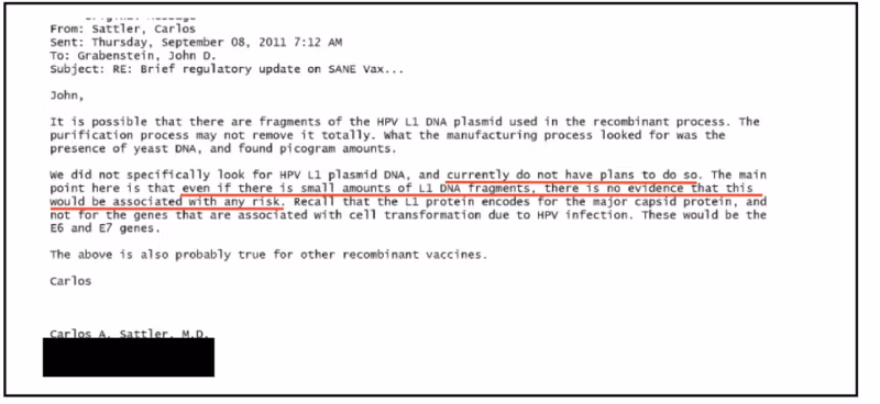 Vastauksena Merckin lääketieteellinen johtaja Carlos Sattler myönsi paljastavan asian kollegoilleen sisäisessä sähköpostiviestissä. Syyskuun 8. päivänä 2011 Sattler myönsi: "Emme etsineet erityisesti HPV L1 -plasmidi-DNA:ta."