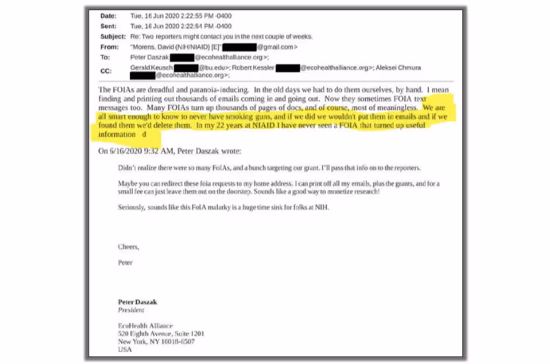 Morens kirjoitti myös, että hän poistaisi sähköpostit, jotka voisivat näyttää "savuavat aseet”välttääkseen pitkäaikaisen ystävänsä Peter Daszakin (EcoHealth Alliance) sotkemisen Covid-19-pandemiaan.”